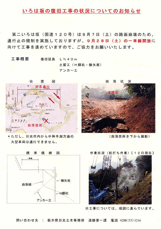 昨日からの雨の影響か、本日第2いろは坂(上り)の20カーブ付近で道路の陥没があり、現在第2いろは坂は不通です。