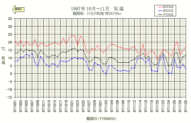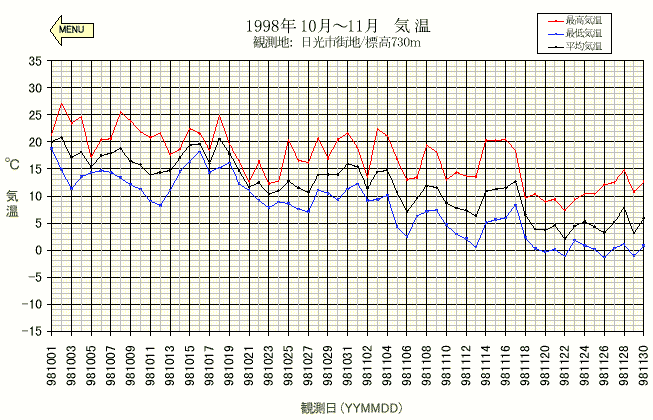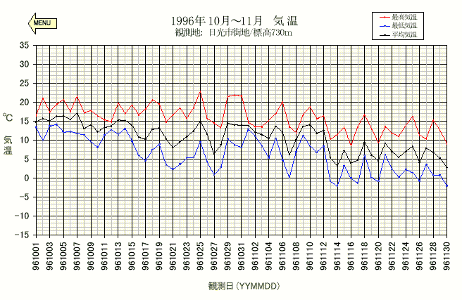 気温ですが、参考までに1996年から1998年の3年間の10月から11月の気温をご紹介します。観測地は日光市内標高730m地点です。