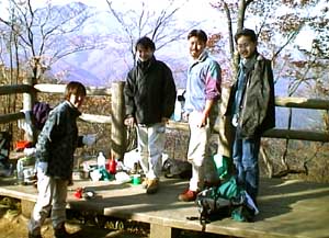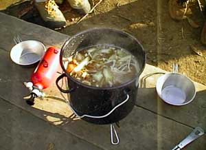 うーまそう。これがきのこ鍋ですか。湯気のたち具合など、実に食欲をそそる写真です。 山で食べるのって、ほんとうにおいしいですよね。でも鍋につきものの熱燗の姿がみえませんが、どうしたのでしょう。 |