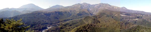 左から、男体山、大真名子山、女峰山、帝釈山。中央の左下に流れている川が神橋で大谷川と合流する稲荷川です。その上流、女峰山の下に白く見えるのが日向ダム、その奥が雲竜渓谷です。