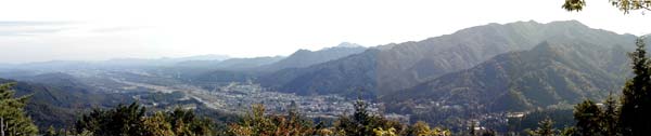 右側の大きな山は鳴虫山、中央の川が大谷川、その右岸に日光市街地が、左上の方向が宇都宮です。