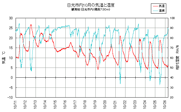 下のグラフは10月11日から今日の朝までの気温と湿度を示したものです。とくにこの3日間の朝は最低気温が5℃程度までさがり、日中の陽光をたっぷりと浴びた広葉樹たちは日増しに色づいてきました。