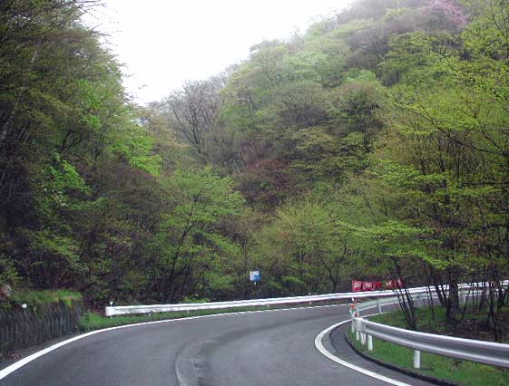 日光市内は小雨。イロハ坂途中はご覧のように新緑の真っ盛り。5〜6カーブの左側にあるシロヤシオは満開の様子です。イロハ坂上部は霧がかかっていて、アカヤシオ群落の写真を紹介することができません。