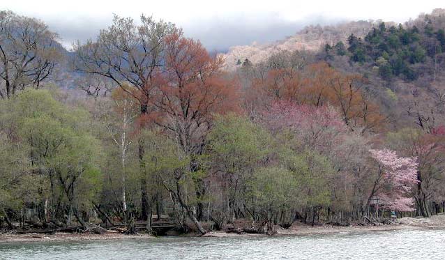 千手ヶ浜から阿世潟にかけては湖の南岸になります。この一帯はブナ・イヌブナが豊富で、ご覧のように黄緑色の新芽を輝かせていました(写真左)。ほとんどがイヌブナのようで、ブナの芽吹きはちょっと遅れます。また中禅寺金谷ホテルの庭に咲きそうだったアズマシャクナゲは詳しくは見られませんでしたが、あちこちに真っ赤な蕾をつけ、あと1週間くらいするときれいな花が見られそうな雰囲気です。