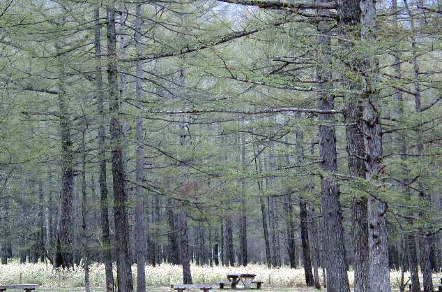 カラマツは新芽を包んでいた茶色の鱗片と新芽そのものの緑色で、遠くから見ると、とても渋いダークグリーンの海のように見えます。写真左が三本松のカラマツの林の色、写真右がその拡大。