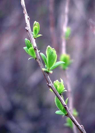 ホザキシモツケは去年咲いた花が実になった枯れ枝がついていましたが、その下には緑色のみずみずしい新芽が顔をだしています。(写真左右)