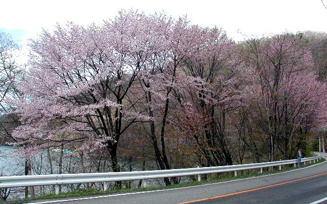 湖畔には昔からオオヤマザクラが植えられていましたが、ちょうど今満開です(写真左)。ご覧のように大柄のピンク色の花をつけるオオヤマザクラはアカヤシオとともに奥日光の春を彩る代表的な花です。中禅寺の繁華街はもちろん、湖の北岸で多く見られます。