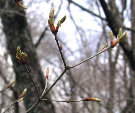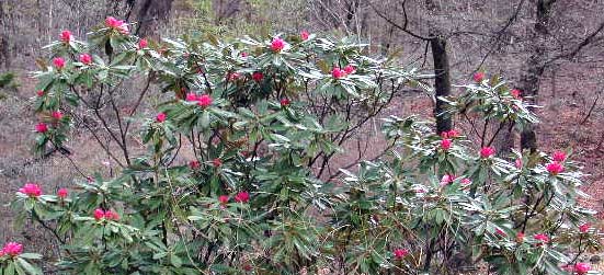中禅寺金谷ホテル近くのミズナラはご覧のようにやっと芽吹いたばかりです。新緑にはまだまだ時間がかかりそうです。また庭に植えられたアズマシャクナゲは蕾をたくさんつけ、今にも咲きそうな気配です(写真左)。同じく植えられたトウゴクミツバツツジも咲き始めでした。中禅寺湖南岸には自生しているアズマシャクナゲが多いのですが、たぶんここと同じような状況かと思います。