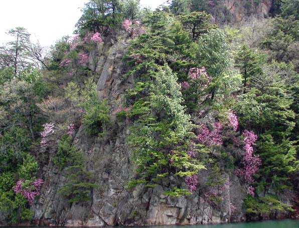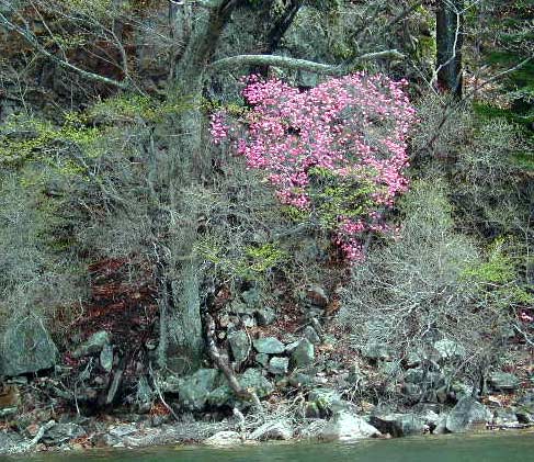 菖蒲ヶ浜から千手ヶ浜は中禅寺湖の北岸になります。ところどころにオオヤマザクラのピンク色、そして、途中の赤岩あたりにはオオヤマザクラよりさらに鮮やかなピンク色のアカヤシオが岩にへばりつくようにたくさん咲いています(写真左)。こちらは満開をちょっと過ぎた感じで、散り始めたアカヤシオもありました(写真右)。
