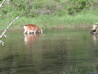 次はシカ。我々の30mほど向こうの湯川に入り、水の中に首を入れてなにやらもぞもぞ。どうも水中の何かを食べているようです。首をすっぽりと川の中に入れ、しばらくすると水中から顔を出しモグモグしています。普段見慣れないものを見たのでとても不思議な光景でした。夜行性のシ