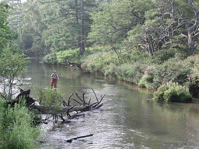 湯川はゆったりと流れ、その流れの中にフライフィッシングをする若者がぽつり、ぽつりと点在します。とても絵になっていたのでつい写真を撮りたくなります。ちょうど釣り上げた方がいて、聞いてみると「イワナ」とのこと。25pくらいの大きさでした。