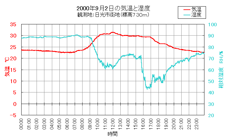 この日のフェーン現象は、こけこっこの家の百葉箱のデータ(14KB)からも読みとることができます。気温は正午に31.4℃となりとても暑かったのですが、午後3時半になるとフェーン現象の影響と思われる湿度の急激な低下があり、午後4時半には最低湿度42.6%を記録しました。夕方は、気温が高いものの、湿度が低くとても快適な気候となりました。