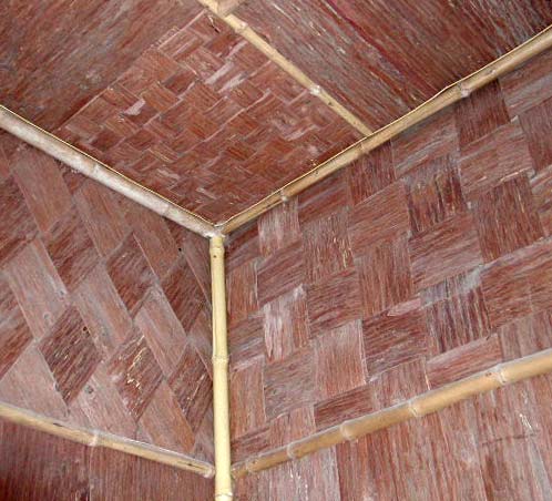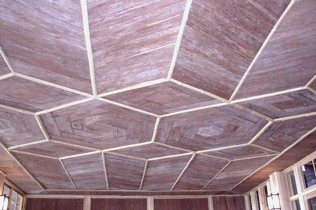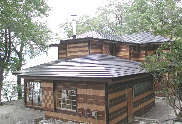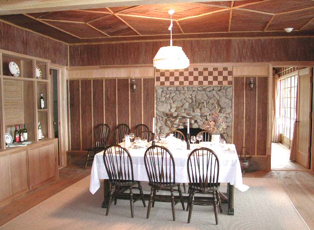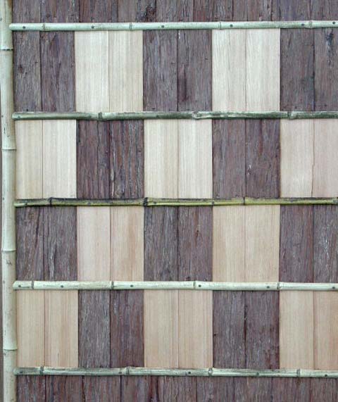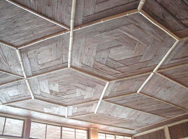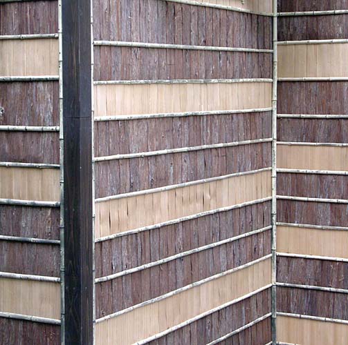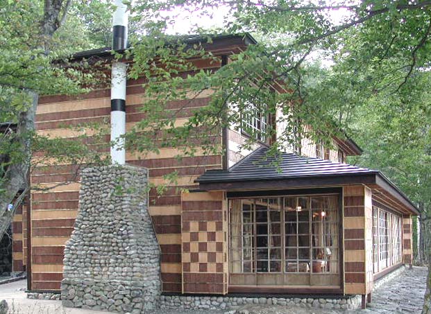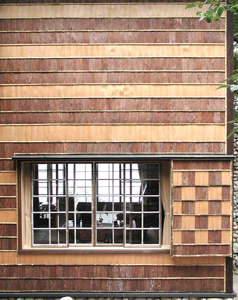 外壁はスギ皮と木端で装飾され、そのコントラストはとても前衛的な印象でありながら、質素であり、不思議と周辺自然環境との調和を保っています。内装もスギ皮の張り方でデザインされ、自然の素材をふんだんに使った木造建築です。西洋建築と日本の自然が生み出した素材がとてもやわらかい調和を見せています。