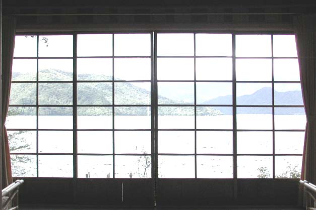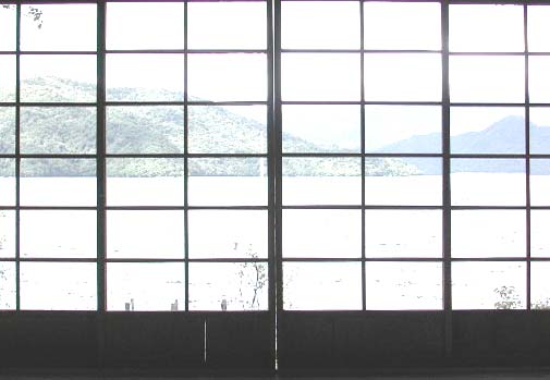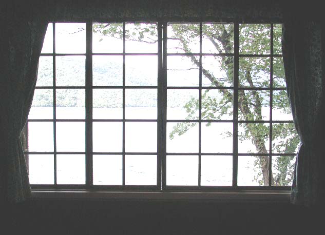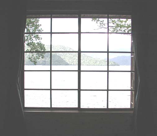 木製の窓枠のゆがみのあるガラスを通して大使館別荘が正面に見えます。