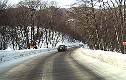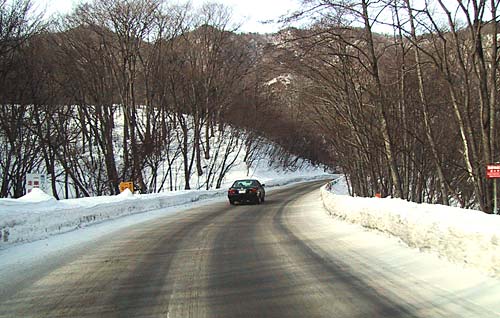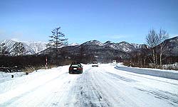 雪は多くありませんが、日蔭の道路は真っ白。チェーン必須です。