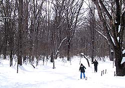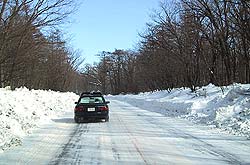 道路は真っ白。まわりのミズナラ林にもたっぷりと雪が積もり。ミヤコザサはすっかり雪の中です。