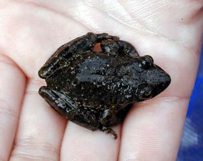 録音も一段落し、鳴き声の主を捜そうと流れる川とその周りの石をじっくりとなめ回しましたが、その主はとうとうみつかりませんでした。右の写真は2年ほど前、同じ場所でみつけたカジカガエルです。今度は鳴いている姿を写真に納めてみたいものです。