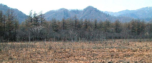戦場ヶ原もまだまだ茶色の湿原のままですが、遠くに見えるカラマツの色は春の色に見えます。