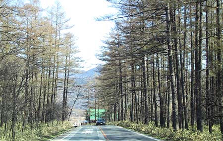 戦場ヶ原の手前、竜頭滝上のミズナラ林はまだ芽吹きには時間がかかりそうですが、カラマツは冬の色から緑色が少し混ざった早春の色にかわりつつあります。