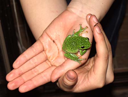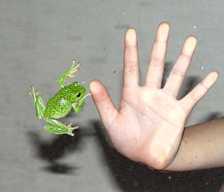 窓ガラスの外側に張り付いていたため、まゆみちゃんもガラスの内側から顔を近づけじっと観察しています。写真を撮った後、カエル好きなかっちゃんは手にのせたいと言いだし、つかまえたモリアオガエルくんを「かわいい、かわいい」としきりに眺めています。