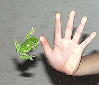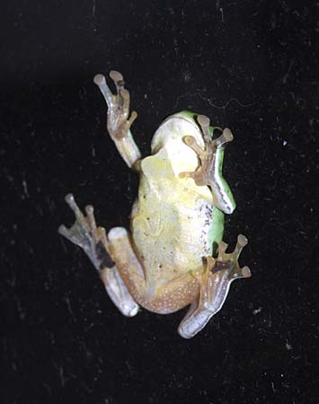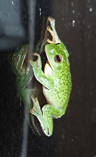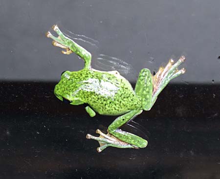 そして、まだ小雨が降る庭の暗闇に放しました。モリアオガエルは暗闇に消えたかと思っていたら、また窓ガラスにピタッと張り付いています。きっと明かりに集まってくる虫が目当てなのでしょうか。