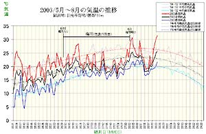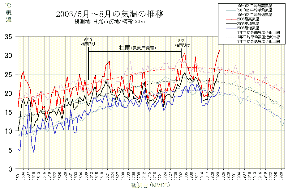 5月から昨日までの気温をグラフとしてまとめましたのでご覧下さい(右)。グラフは日光市街地にあるこけこっこ家の百葉箱で観測したデータで、今年の気温とともに、過去7年間測定してきた平均値、さらにその近似曲線を掲載しました。