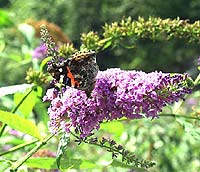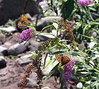 さて、8月23日、稲荷川を歩いてみました。河原はヤマハハコの花などが咲く季節となり、100mほど離れた堰堤の上にこのフサフジウツギの大きな株が花を咲かせているのが見えます。そして、よく目を凝らしてみると、無数の蝶がそのまわりを飛び回っているのに気づきました。近づいて見ると、ヒョウモンチョウ類やセセリチョウ類、タテハチョウ類がフサフジウツギの周りに群れ飛び、盛んに蜜を吸っています。まさに Butterfly Bush です。