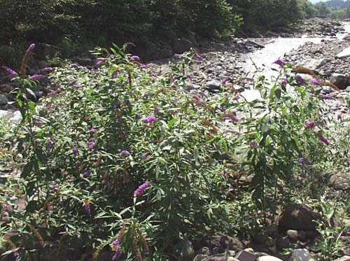 6月から9月にかけて、日光市内の大谷川や稲荷川の河原に、ピンク色をした房状の花が咲いているのを良くみかけます。花も派手な色でとても目立ち、甘い香りが辺り一面漂うので、何の花だろうと不思議に思った方もいらっしゃるのではないでしょうか。この花は、中国原産の外来種、フサフジウツギ (Buddleia davidii) です。