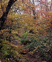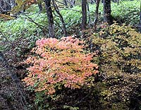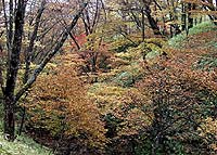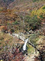 右の写真は裏見ノ滝上流にある「慈観の滝(じかんのたき)」。モッコ平の入口です。滝の周辺の深い森の紅葉は終わりかけているようにも見えます。