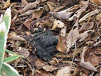 目についたのは、左の写真のクマ棚。クマ棚はクマがミズナラなどの実がなる樹木に登り、実を食べるために枝を引き寄せたものを言います。あちらこちらのミズナラでこのクマ棚が見られました。ミズナラのドングリが豊作だった去年は気づかなかったのですが、今年は食べるものが少ないせいかクマも生きるために必死です。近くにはクマの糞(写真右)も見られました。