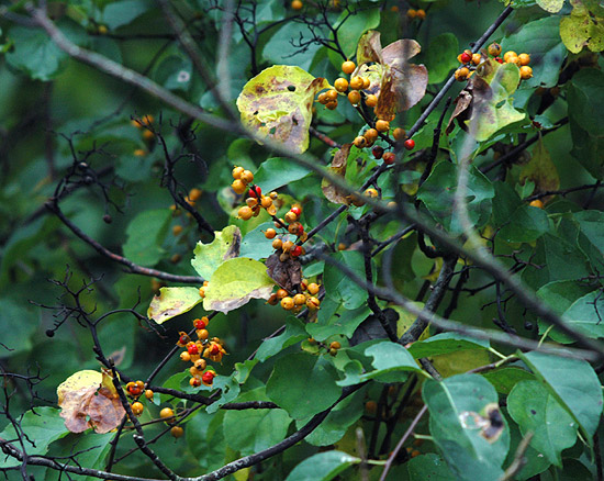 ツリバナとともにニシキギ科のツルウメモドキ(写真右)も赤い実をはじかせてきたようです。