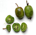 サルナシ=猿梨という名は、サルが好んで食べるからつけられた名のようです。サルが好むだけあって、完熟したサルナシの味は酸味や甘味といい、キウィフルーツとほとんど同じです。スーパーで出回っているキウィーフルーツは完熟しない堅い果実を出荷するので、むしろ完熟サルナシの方が味がいいかもしれません。写真のようにサルナシを切ってみるとキウィーフルーツとそっくりなことがわかるでしょう。