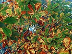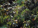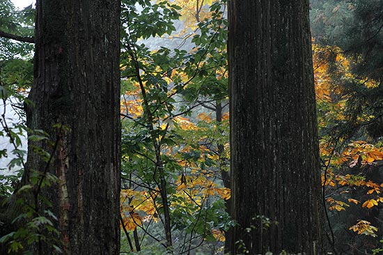 この滝尾の森では、他の木々がまだ紅葉しないこの時期、いち早くトチノキが黄色く色づきます。スギの暗い森にトチノキの黄葉が華やかさが森を明るくしてくれます。でも一斉に黄葉するのではなく、陽光が当たらない場所はまだ緑色をしていて、黄葉が進んでいる葉と遅れている葉がモザイクのようになり、不思議な美しさを見せてくれます。
