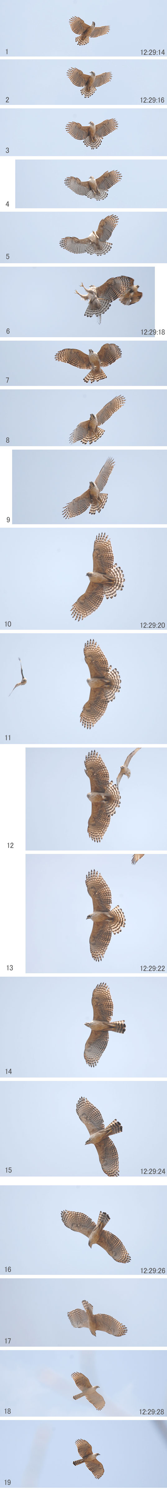 カメラの最望遠側(35ミリ換算でf=750mm)で連射していたら後半はフレームからはみ出してしまうくらい近距離の出会いでした。その間、わずか14秒間ですがその連続写真をご紹介します。右の写真をクリックすると写真が拡大されます。写真の番号で解説を。