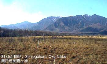 左の写真は、戦場ヶ原と男体山です。中央横に黄葉している森が見えますが、これがカラマツ。ほとんど人工植林されたものです。 |