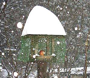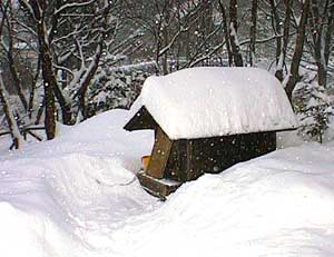 雪がてんこ盛りになった小鳥用のエサ台(写真)には一日中、シジュウカラ、ヒガラ、ヤマガラがヒマワリの種を食べにやってきます。雪が積もると山に食べ物がなくなるのか、とくにたくさんやってきます。