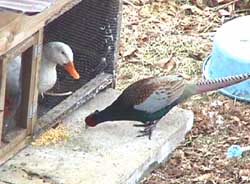 なぜかアヒル君と仲良しになり(アヒル君がキジ♂につきまとっていた)いまでは網こしに愛を語らう仲となりました。(アヒル君は♀だったのです)