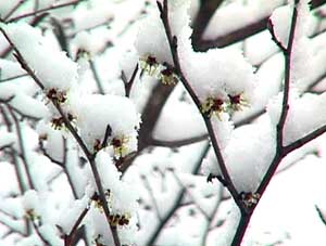春の雪はすべての木々の一本一本の枝を白い枝に変え、2月末から咲いているマンサクの花もごらんのとおり、重そうな雪に迷惑そうです。
