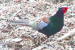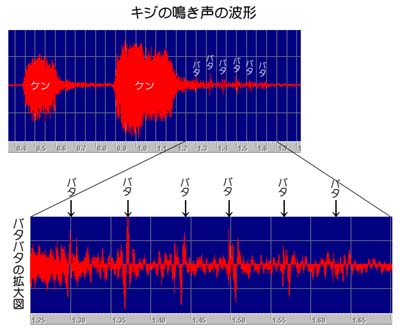 繁殖期のキジ♂は「ケン・ケン」と鳴きますが、その後に必ず羽を素早く羽ばたかせ、「バタバタ」という音が付け加わります。