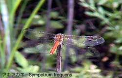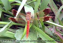 写真の右下、ミヤマアカネは数は少ないのですが、真っ先に赤くなり、羽の中間くらいが黒くなっていて、羽全体が薄いピンク色をしている、妙に派手で、お化粧をしたようにきれいなトンボです。