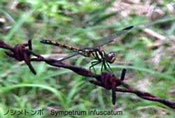 でも、その中に少しだけ、違った赤トンボが混ざっています。ノシメトンボとミヤマアカネです。