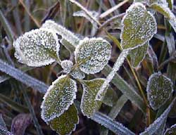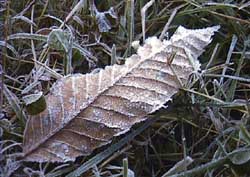 車や家の屋根も霜で真っ白です。早く紅葉した木々の落ち葉にも霜がつき、いよいよ冬を迎える季節となりました。庭の木々はいよいよ紅葉の最盛期を迎え、そして氷が張り(昨年の初氷は11月2日)静かな冬の季節になります。