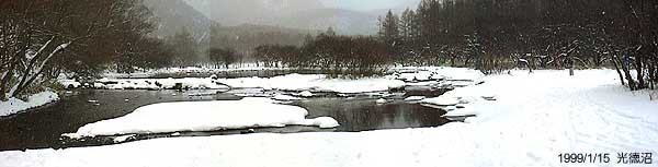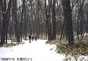 光徳周辺ではまだササが顔を出している程度の雪ですが、クロスカントリースキーのコースには充分の積雪があり、雪の中、大勢の人が楽しそうに歩いていました。でも、今日は気温が低いため、雪がフカフカでスキーを履いても結構沈んでいます。3月になると雪も締まり暖かい日射しの中を楽しめるのですが。