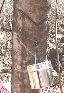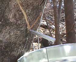 沢沿いのガレたところにある4本のイタヤカエデと1本のカジカエデをみつけ、右の写真のように空き缶を針金で幹にしばり、幹の1/3周ほどの長さを、V字型にカッターで3ミリほどの溝を彫りました。