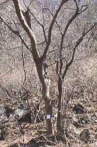 空き缶の上にV字型の切れ込みが見えます。その上に黒っぽくなったV字型がありますが、これは10年前に樹液をとった跡です。