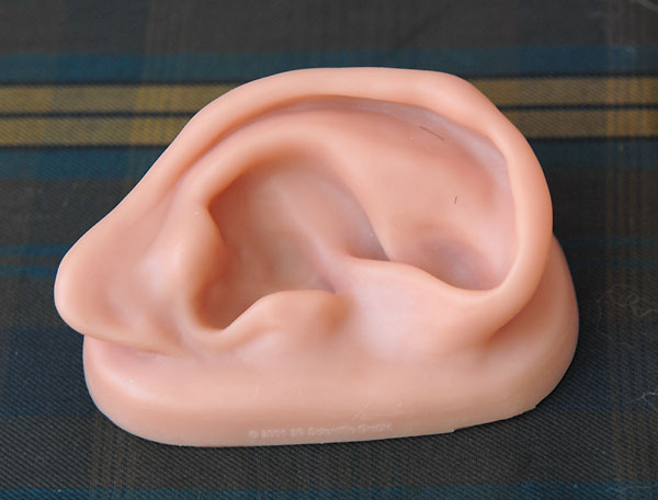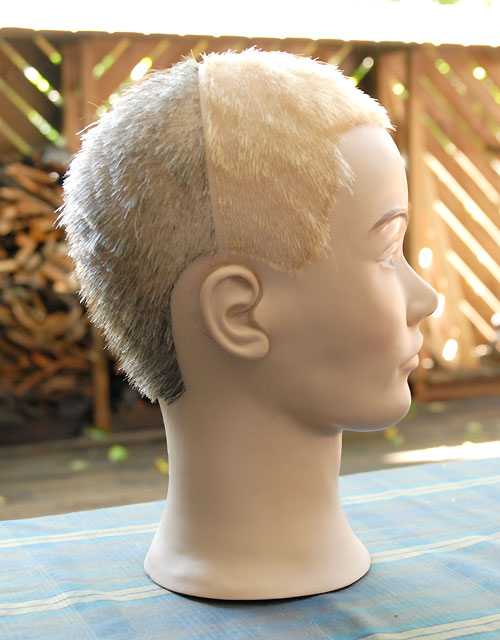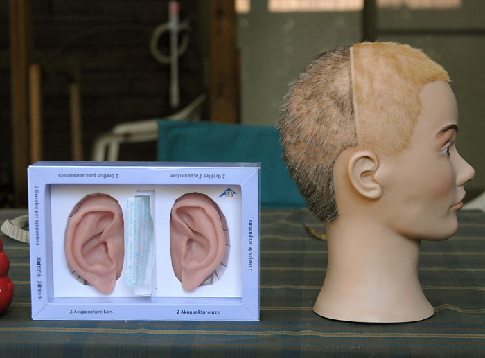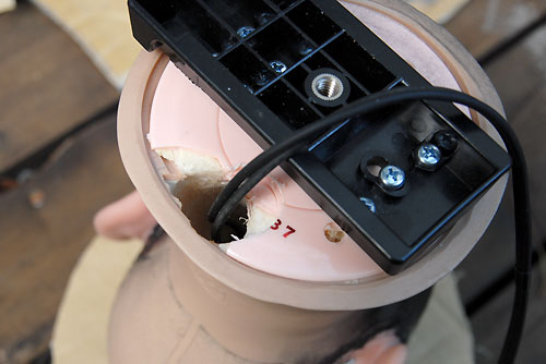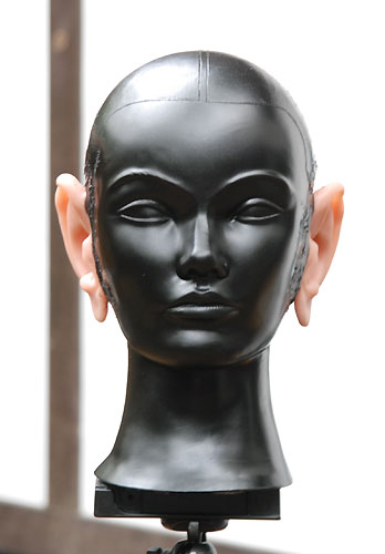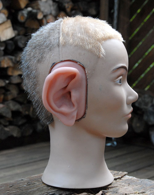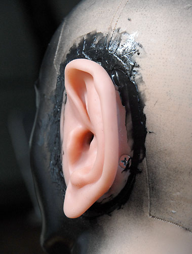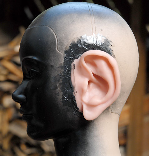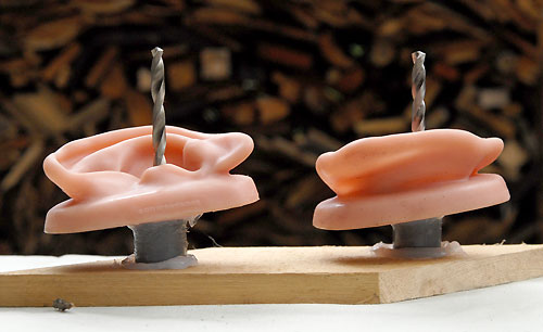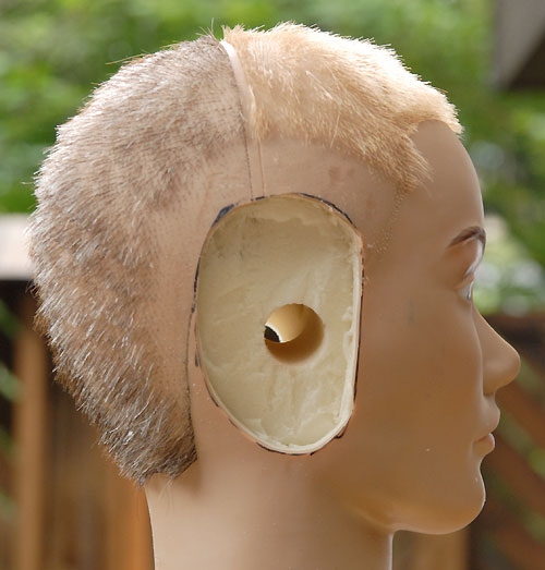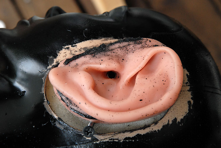 | いよいよ完成しました。 次女が、このダミーヘッドをなぜか「たけし君」と命名。女性のダミーヘッドの場合は「せつ子」なんだそうで。オリーブグリーンのたけし君を外に連れ出し、早速録音してみます。