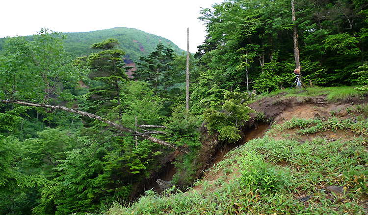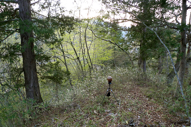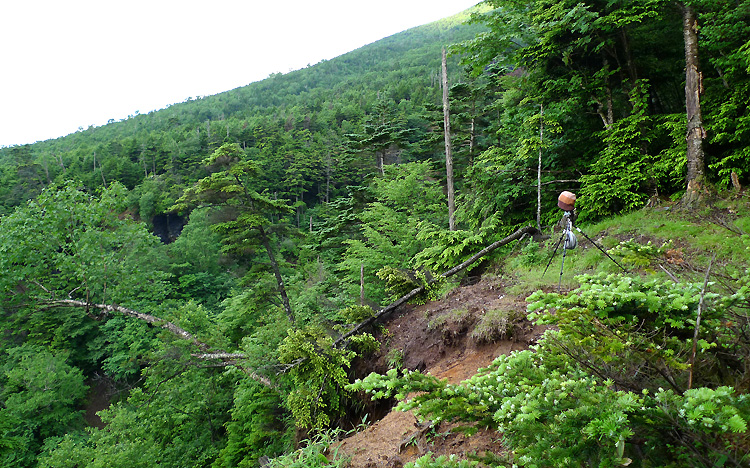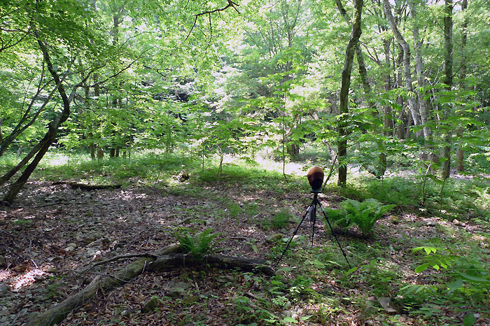 |  | ブナ林の深い森の中に小さな尾根が張り出しています。そこは尾根に多いヒメコマツの大木などに囲まれ、ブナの森を一望できるところにあります。 その尾根に、さえずりのピークを迎えるまだ薄暗い午前4時過ぎダミーヘッドを置きました。たくさんの鳥たちが一斉に鳴き競います。