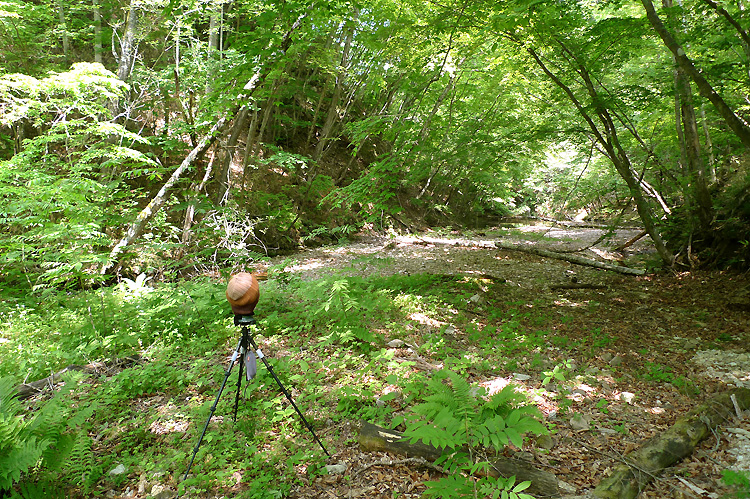|  | 沢が流れる先には小さな堰堤があり、その堰堤の水にモリアオガエルが金属的な声で夜中鳴き交わします。 そしてまだ暗い中3:45くらいから真っ先にアカハラが鳴き始めます。モリアオガエルの鳴き声に代わりクロツグミなどの囀りが加わり、朝の賑やかさを演出していきます。